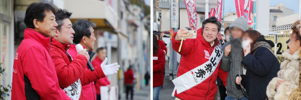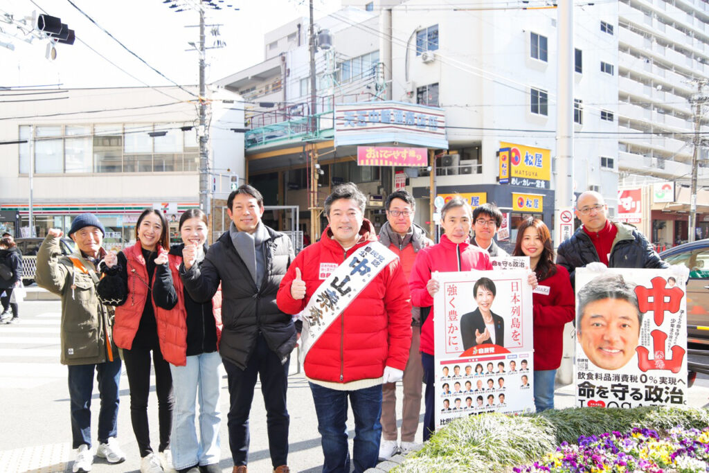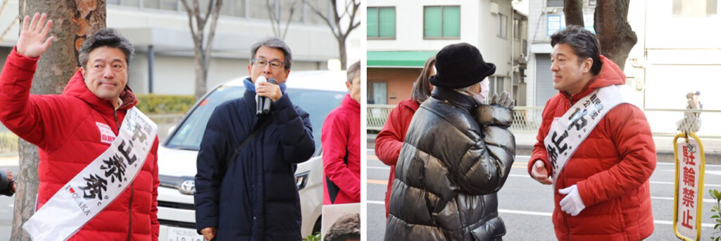 中崎町交差点の街頭演説は予定よりも10分ほど遅れて到着し、お待たせしてしまったにも関わらず演説に耳を傾けてくだりありがとうございました。