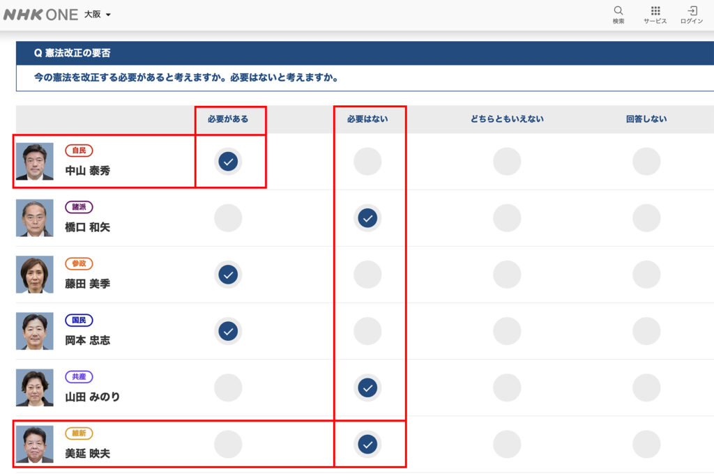 門田先生から教えて頂いた、大阪4区候補者によるNHKのアンケート調査を見てみると、維新の会ながら保守ではない人が対抗馬だった事に気付かされました。