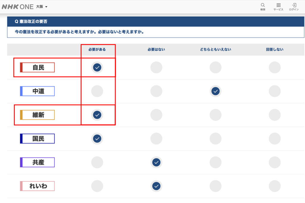 ↓維新のミノべ氏は、憲法改正の必要はない、と回答されています。